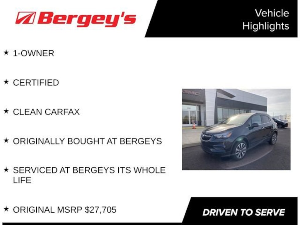 With its low mileage of just 20,469 and a Clean CARFAX report, this 2022 Buick Encore Preferred is a true gem. Backed by Bergeys' exceptional service and commitment to customer satisfaction, this vehicle is ready to provide you with years of reliable and enjoyable driving.