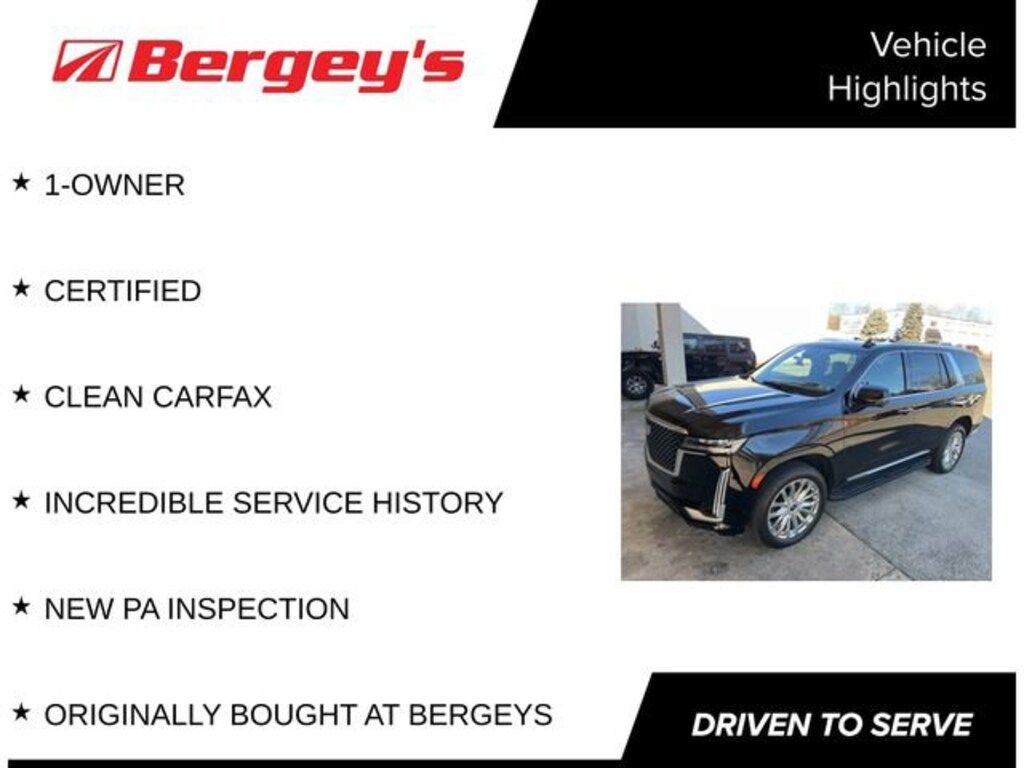 Cadillac Certified Pre-Owned Certified, AWD, Black Leather, 16.9 Diagonal OLED Infotainment Screen, 19 Speakers, 2-Presets Memory For Driver Seat Adjuster, 3.23 Axle Ratio, 3rd row seats: split-bench, 4-Way Power Driver Lumbar Seat Adjuster, 4-Way Power Front Passenger Lumbar Seat Adjuster, 4-Wheel Disc Brakes, 8-Way Power Driver Seat Adjuster, 8-Way Power Front Passenger Seat Adjuster, ABS brakes, Adaptive Cruise Control, Air Conditioning, AKG Studio 19-Speaker Audio System, Alloy wheels, AM/FM radio: SiriusXM with 360L, Apple CarPlay/Android Auto, Audio memory, Auto High-beam Headlights, Auto tilt-away steering wheel, Auto-dimming door mirrors, Auto-dimming Rear-View mirror, Automatic Seat Belt Tightening, Automatic temperature control, Brake assist, Bumpers: body-color, Compass, Delay-off headlights, Door Lock & Latch Shields, Driver door bin, Driver vanity mirror, Dual front impact airbags, Dual front side impact airbags, Electronic Stability Control, Emergency communication system: OnStar and Cadillac connected services capable, Enhanced Automatic Emergency Braking, Enhanced Automatic Parking Assist, Exterior Parking Camera Rear, Four wheel independent suspension, Front anti-roll bar, Front Bucket Seats, Front Center Armrest w/Storage, Front dual zone A/C, Front reading lights, Fully automatic headlights, Garage door transmitter, Glass Breakage Sensor, HD Radio, Heads-Up Display, Heated & Ventilated Driver & Front Passenger Seats, Heated door mirrors, Heated Driver & Front Passenger Seats, Heated front seats, Heated rear seats, Heated steering wheel, Illuminated entry, Lane Change Alert w/Side Blind Zone Alert, Leather Seating Surfaces w/Mini-Chevron Perf Inserts, Low tire pressure warning, Mechanical Limited-Slip Differential, Memory seat, Navigation System, Not Equipped w/2nd Row Express-Up Window Control, Occupant sensing airbag, Outside temperature display, Overhead airbag, Overhead console, Panic alarm, Passenger door bin, Passenger vanity mirror, Power door mirrors, Power driver seat, Power Liftgate, Power moonroof, Power Panoramic Tilt-Sliding Sunroof, Power passenger seat, Power steering, Power windows, Preferred Equipment Group 1SB, Premium Smooth Ride Suspension, Radio data system, Radio: AM/FM w/Navigation, Rain sensing wipers, Rear air conditioning, Rear anti-roll bar, Rear Camera Mirror, Rear Camera Mirror Washer, Rear Cross Traffic Alert, Rear reading lights, Rear window defroster, Rear window wiper, Reconfigurable Full-Color Head-Up Display, Remote keyless entry, Reverse Automatic Braking, Running Board Assist Steps, Security system, SiriusXM w/360L, Speed control, Split folding rear seat, Spoiler, Steering wheel memory, Steering wheel mounted audio controls, Tachometer, Teen Driver, Telescoping steering wheel, Theft-Deterrent Alarm System, Tilt steering wheel, Traction control, Trip computer, Turn signal indicator mirrors, Variably intermittent wipers, Vehicle Inclination Sensor, Vehicle Interior Movement Sensor, Ventilated front seats, Voltmeter, Wheel Locks, Wheels: 22 14-Spoke Alloy w/Polished Finish, Wireless Apple CarPlay/Wireless Android Auto, 1-OWNER, CERTIFIED, CLEAN CARFAX, INCREDIBLE SERVICE HISTORY, NEW PA INSPECTION, ORIGINALLY BOUGHT AT BERGEYS, AWD, Black Leather. CARFAX One-Owner. Black Raven 2024 Cadillac Escalade Premium Lu