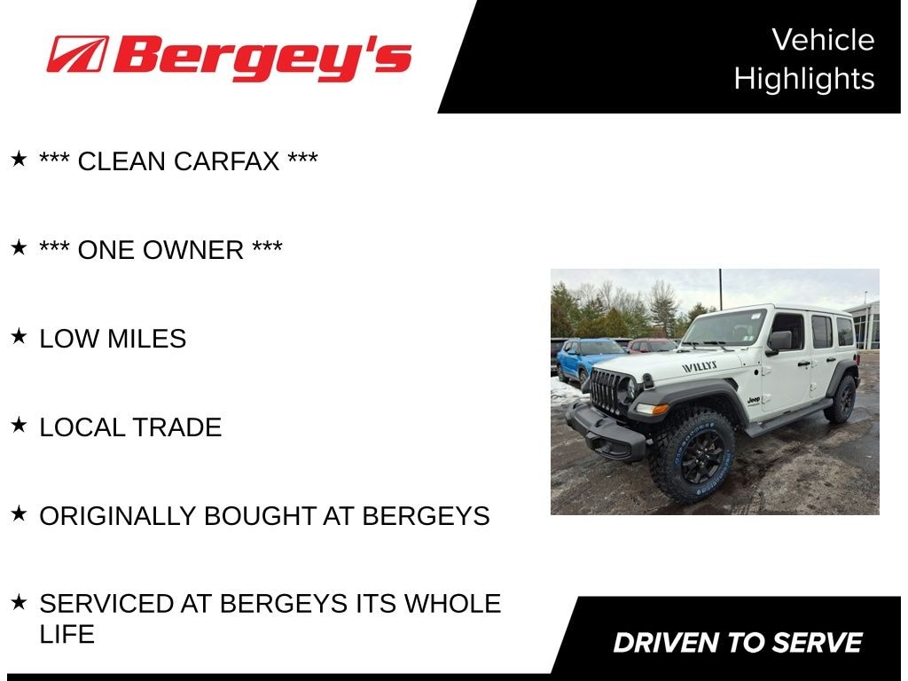 Command rugged capability and proven dependability with this 2021 Jeep Wrangler Unlimited Willys, proudly offered at Bergeys Chevrolet in Colmar, PA. Bought and serviced right here at Bergeys, this Wrangler carries a history you can trust, backed by consistent care and a transparent maintenance story. The Willys edition delivers iconic Jeep styling, trail-ready performance, and the open-air freedom enthusiasts loveall wrapped in a well-maintained package ideal for both adventure seekers and daily drivers. If youre searching for a Wrangler with authenticity, reliability, and dealership-backed confidence, visit Bergeys Chevrolet in Colmar and see why drivers from Doylestown, Sellersville, and Quakertown choose Bergeys for quality vehicles and exceptional service.