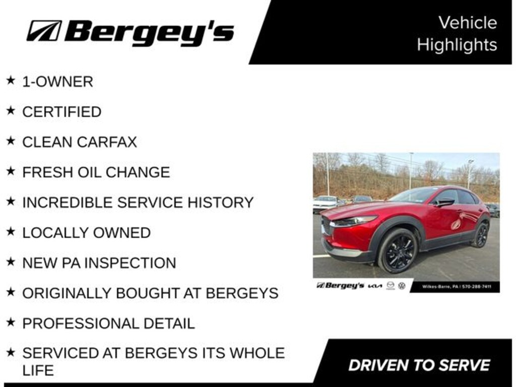 Certified. Soul Red Crystal Metallic 2025 Mazda CX-30 2.5 S Select Sport AWD 6-Speed Automatic SKYACTIV® 2.5L 4-Cylinder DOHC 16V 1-OWNER, CERTIFIED, CLEAN CARFAX, FRESH OIL CHANGE, INCREDIBLE SERVICE HISTORY, LOCALLY OWNED, NEW PA INSPECTION, ORIGINALLY BOUGHT AT BERGEYS, PROFESSIONAL DETAIL, SERVICED AT BERGEYS ITS WHOLE LIFE.