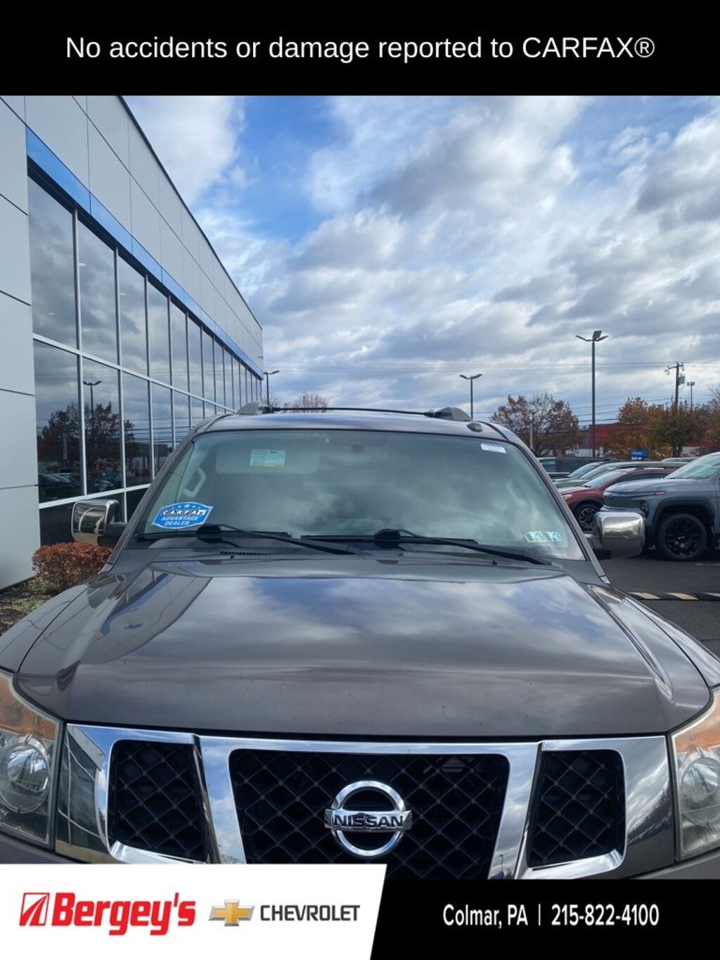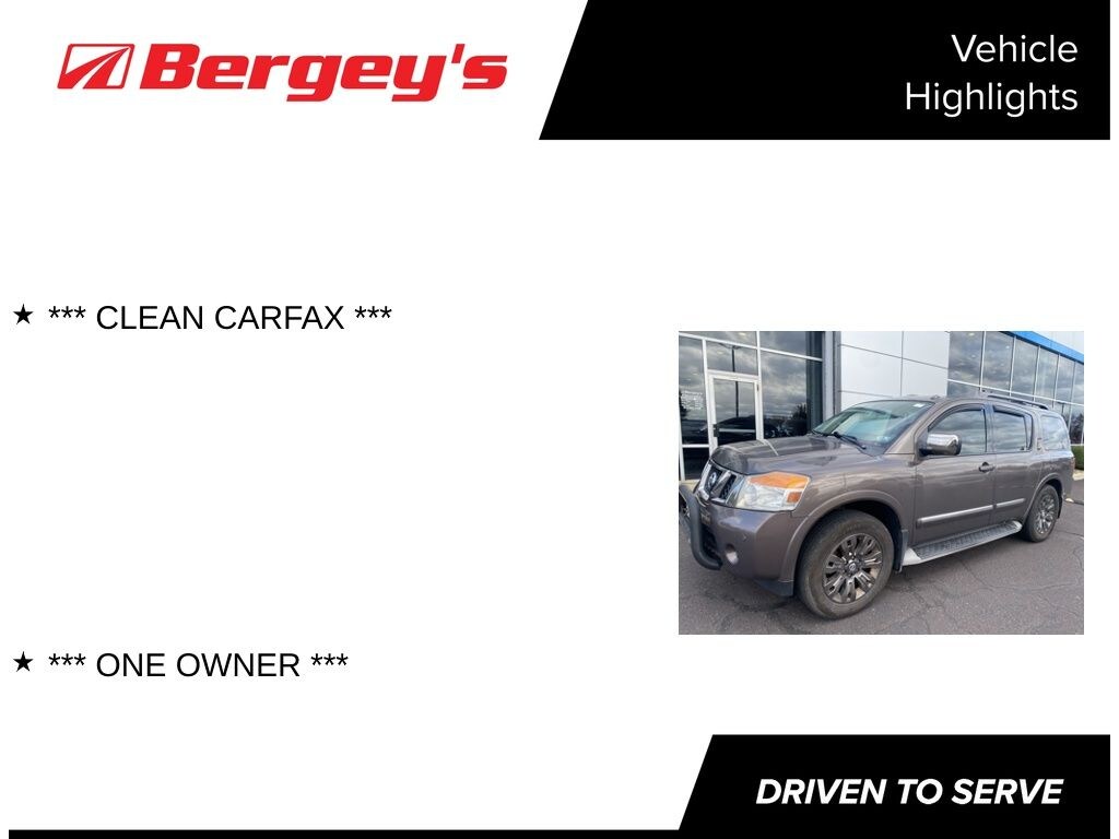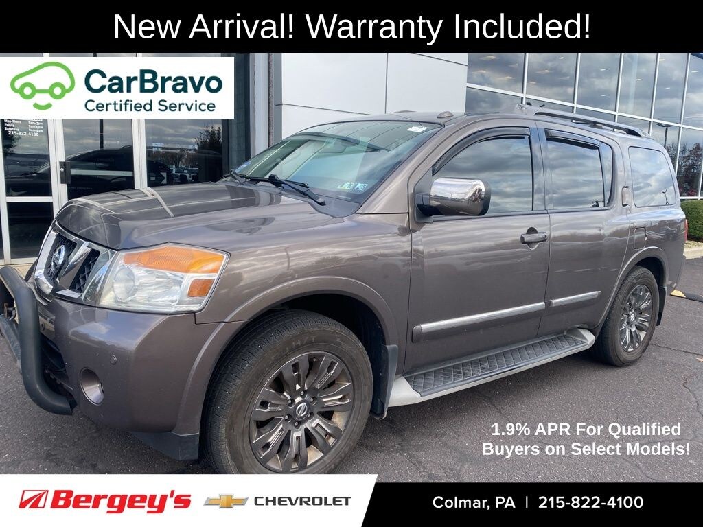 Get ready to turn heads in this bold and refined **2015 Nissan Armada Platinum**, now available at Bergey's Chevrolet in Colmar, PA. With rich leather seating, advanced tech features, a commanding V8 engine, and third-row space for the whole crew, this SUV blends luxury and muscle in one stylish package. Whether you're heading out for a weekend adventure or cruising through Montgomery County with family in tow, this Armada Platinum delivers premium comfort and standout presence stop by Bergeys Chevrolet in Colmar today and make it yours!