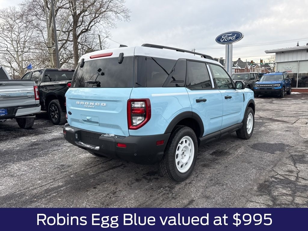 Robins Egg Blue 2025 Ford Bronco Sport Heritage 4WD 8-Speed Automatic 1.5L EcoBoost Convenience Package, Equipment Group 250A, Front Driver/Passenger Seat Back Map Pockets, Heated 8-Way Power Driver's Seat, LED Fog Lamps, Power Moonroof, Premium Wrapped Steering Wheel, Universal Garage Door Opener (UGDO).