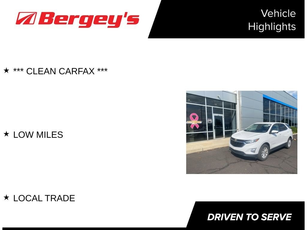 Get ready to elevate your everyday drive around Montgomery County with this sleek 2020Chevrolet Equinox LT, now available at Bergeys Chevrolet in Colmar, PA! Featuring a turbocharged1.5L4cyl engine delivering 170hp and 203lbft of torque, it offers excellent fuel efficiency (up to 26mpg city / 32mpg highway) while giving you enough space for gear, groceries, and weekend getaways. Inside, you'll find smart tech like AppleCarPlay & AndroidAuto, a power adjust driver's seat, and that roomy helm that welcomes every Millennial, commuter, or family driver in the Bucks/Montgomery area. With its blend of style, comfort, and performance, this Equinox LT is the perfect companion for your drive through Colmar, Hatfield, Lansdale and beyond. Swing by Bergey Chevrolet today and take it for a spin!