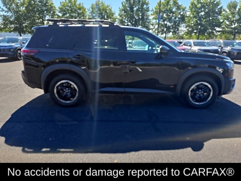 New Price! 4WD, 3rd row seats: bench, 4-Wheel Disc Brakes, 6 Speakers, ABS brakes, Air Conditioning, Alloy wheels, AM/FM radio: SiriusXM, Auto High-beam Headlights, Automatic temperature control, Axle Ratio: 4.334, Black Splash Guards (Set of 4), Brake assist, Delay-off headlights, Driver door bin, Driver vanity mirror, Dual front impact airbags, Dual front side impact airbags, Electronic Stability Control, Emergency communication system: NissanConnect Services, Four wheel independent suspension, Front anti-roll bar, Front Bucket Seats, Front Center Armrest, Front dual zone A/C, Front fog lights, Front reading lights, Fully automatic headlights, Heated door mirrors, Heated Front Bucket Seats, Heated front seats, Illuminated entry, Knee airbag, Leather steering wheel, Leatherette Seating Surfaces, Low tire pressure warning, NissanConnect featuring Apple CarPlay and Android Auto, Occupant sensing airbag, Outside temperature display, Overhead airbag, Overhead console, Panic alarm, Passenger door bin, Passenger vanity mirror, Power door mirrors, Power driver seat, Power steering, Power windows, Radio data system, Radio: AM/FM Audio System w/NissanConnect, Rear air conditioning, Rear anti-roll bar, Rear Parking Sensors, Rear reading lights, Rear side impact airbag, Rear window defroster, Rear window wiper, Reclining 3rd row seat, Remote keyless entry, Rock Creek AS Floor Liners & Cargo Area Protector, Roof rack, Security system, Speed control, Speed-sensing steering, Split folding rear seat, Spoiler, Steering wheel mounted audio controls, Tachometer, Telescoping steering wheel, Tilt steering wheel, Traction control, Trip computer, Turn signal indicator mirrors, Variably intermittent wipers, Wheels: 18" Beadlock Styled Design, 4WD. Clean CARFAX. CARFAX One-Owner. Super Black 2023 Nissan Pathfinder Rock Creek 4WD 9-Speed Automatic V6