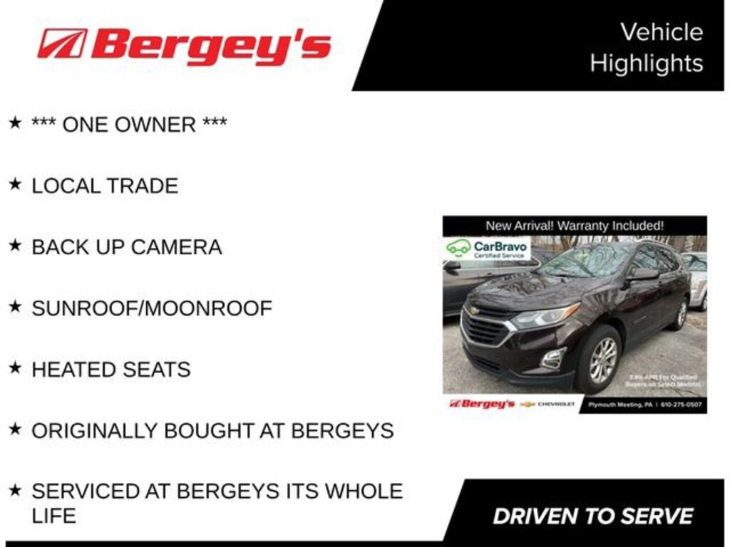 Recent Arrival! *** ONE OWNER ***, LOCAL TRADE, BACK UP CAMERA, SUNROOF/MOONROOF, HEATED SEATS, ORIGINALLY BOUGHT AT BERGEYS, SERVICED AT BERGEYS ITS WHOLE LIFE, AWD. Certified. Certification Program Details: *6-Month/6,000-Mile Bumper-to-Bumper Limited Warranty*, whichever comes first, in addition to any remaining original factory Bumper-to-Bumper warranty. See participating dealer and warranty booklet for limited warranty eligibility and coverage details, including limitations and exclusions. *Except for non-GM vehicles in the State of California, where coverage will be provided by a vehicle service contract. Odometer is 8677 miles below market average!25/30 City/Highway MPGAwards:* 2020 IIHS Top Safety Pick with specific headlights2020 Chocolate Metallic Chevrolet Equinox AWD 1.5L DOHC 6-Speed Automatic Electronic with Overdrive