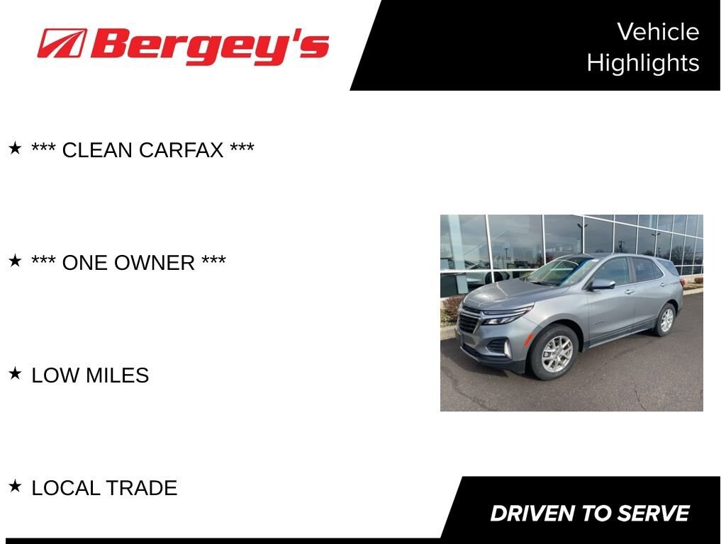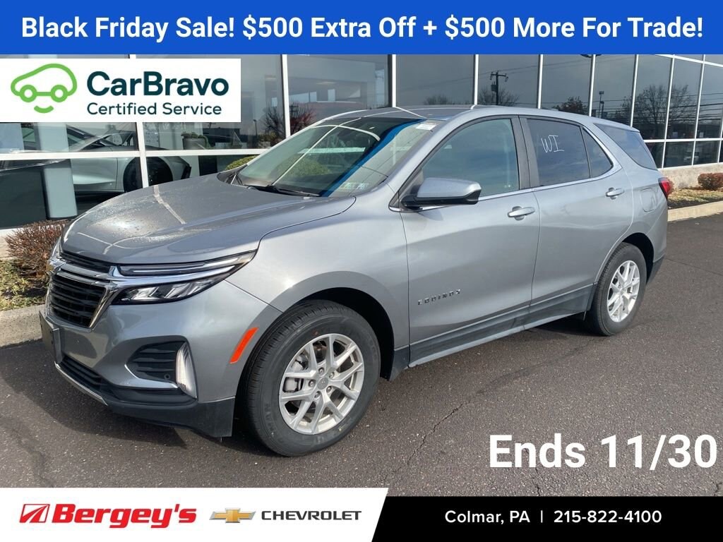 Recent Arrival!Discover versatility, style, and modern tech in the 2024 Chevrolet Equinox LT, now available at Bergeys Chevrolet in Colmar, PAyour trusted local Chevy destination. This sleek and efficient compact SUV delivers a smooth ride, impressive fuel economy, advanced safety features, and a spacious interior perfect for families, commuters, and weekend adventurers. With its smart connectivity, comfortable seating, and refined design, the 2024 Equinox LT offers everything you need for daily driving around Montgomery County and beyond. Visit Bergeys Chevrolet in Colmar, PA today to explore this exceptional 2024 Equinox LT and experience why it remains one of Chevys most popular SUVs!Clean CARFAX. CARFAX One-Owner.CarBravo Limited Bumper-to-Bumper Warranty When you choose a certified used vehicle less than 10 model years old and with less than 100,000 miles, you'll get 6-month/6,000-mile * limited bumper-to-bumper warranty coverage with no deductible. Ownership Benefits: *Courtesy Transportation *24-Hour roadside assistance *1-month trial of Onstar Connected Services or Onstar Guardian app *3-month trial of SiriusXM *Support from one of the largest nationwide service networks *24/30 City/Highway MPG2024 Sterling Gray Metallic Chevrolet Equinox AWD 1.5L DOHC 6-Speed Automatic Electronic with Overdrive