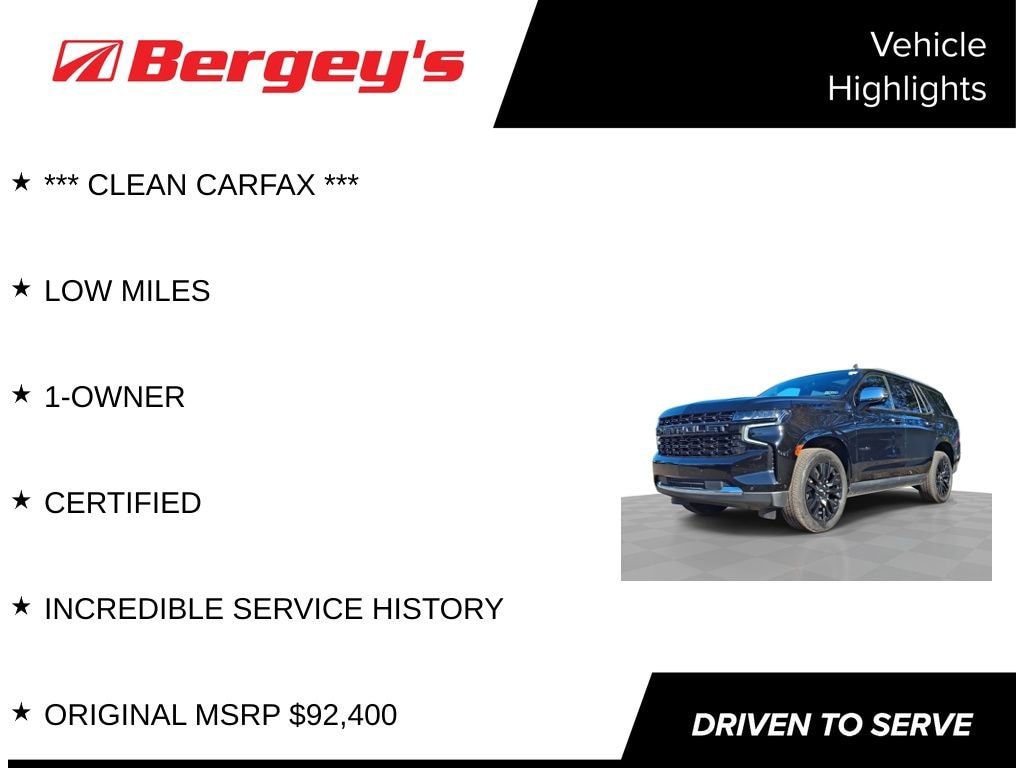 Get ready to dominate the roads from Colmar to Doylestown and Sellersville in the ultra luxurious 2024 Chevrolet Tahoe Premier, now available at Bergeys Chevrolet in Colmar, PA! This toptier fullsize SUV serves up serious power thanks to its 6.2L V8 engine delivering 420hp and 460lbft of torque alongside upscale features like Magnetic Ride Control, heated & ventilated front seats, a heated steering wheel, and a 10speaker Bose surround audio system. With seating for the whole crew and room for all your gear plus a tech rich cabin packed with wireless AppleCarPlay/AndroidAuto and available Super Cruise handsfree driving its built for everything from Montgomery County errands to weekend escapes in Bucks County. Swing by Bergeys Chevrolet in Colmar and experience how the 2024 Tahoe Premier blends capability, comfort, and class into your next adventure!