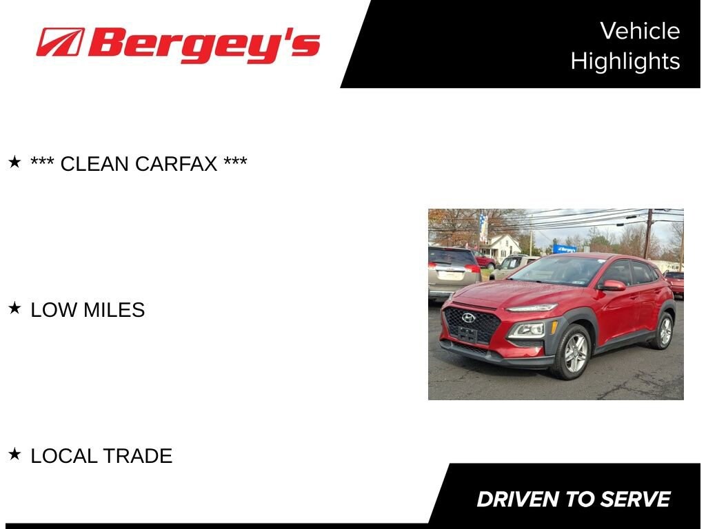 Get ready for fun, efficiency, and style with the 2020 Hyundai Kona SE, now available at Bergeys Chevrolet in Colmar, PA! This sporty subcompact SUV delivers nimble handling, excellent fuel economy, and a bold design that stands out on every road in Montgomery County. Inside, you'll find comfortable seating, smart connectivity features, and versatile cargo space perfect for commuters, first-time drivers, or anyone who wants a practical yet exciting ride. If you're searching for a reliable and stylish crossover, the 2020 Hyundai Kona SE at Bergeys Chevrolet in Colmar, PA is a must-see. Stop in today and take this fun-loving SUV for a spin!