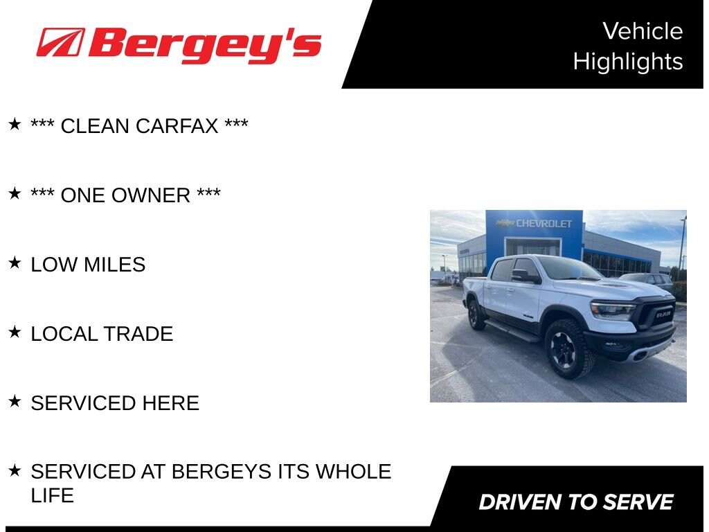 Recent Arrival! *** CLEAN CARFAX ***, *** ONE OWNER ***, LOW MILES, LOCAL TRADE, SERVICED HERE, SERVICED AT BERGEYS ITS WHOLE LIFE. Clean CARFAX. CARFAX One-Owner. Priced below KBB Fair Purchase Price! Odometer is 6750 miles below market average!CarBravo Limited Bumper-to-Bumper Warranty When you choose a certified used vehicle less than 10 model years old and with less than 100,000 miles, youâll get 6-month/6,000-mile * limited bumper-to-bumper warranty coverage with no deductible. Ownership Benefits: *Courtesy Transportation *24-Hour roadside assistance *1-month trial of Onstar Connected Services or Onstar Guardian app *3-month trial of SiriusXM *Support from one of the largest nationwide service networks *Awards:* Motor Trend Automobiles of the year * JD Power Automotive Performance, Execution and Layout (APEAL) Study2021 Bright White Clearcoat Ram 1500 4WD HEMI 5.7L V8 Multi Displacement VVT 8-Speed Automatic